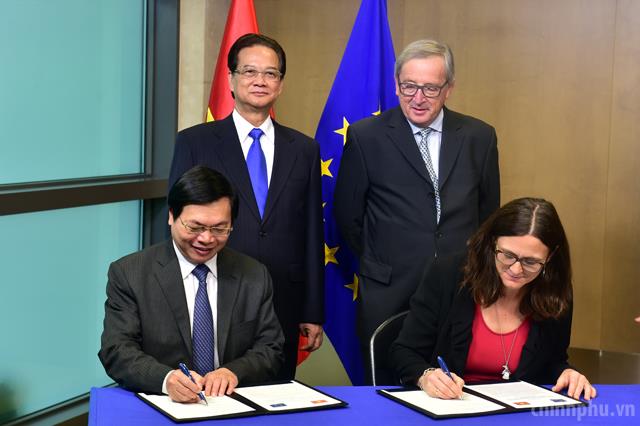 PM Dung and President of the European Commission Jean-Claude Juncker witness the signing ceremony to conclude free trade agreement talks between Viet Nam and the EU. Photo: VGP.
