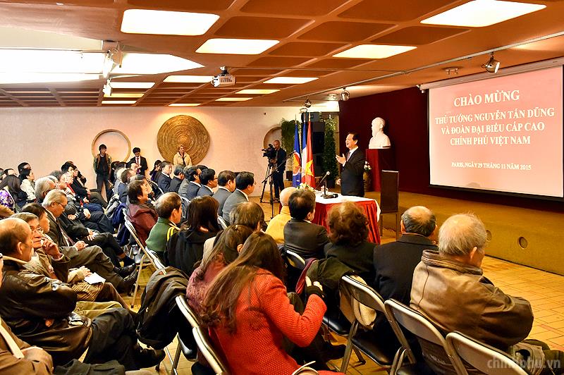 PM Dung meets overseas Vietnamese and Embassy staff in Paris. Photo: VGP.