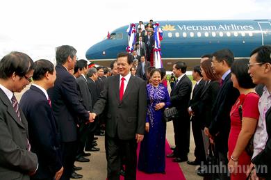 PM Nguyễn Tấn Dũng and his spouse at Vạt Tày Airport, Vientiane, Laos - Photo: VGP