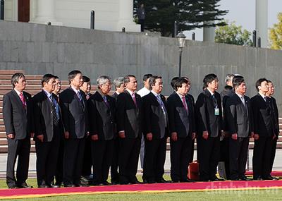 Minister-Chairman of the Office of Government Vũ Đức Đam, Minister of Construction Trịnh Đình Dũng, Minister of Planning and Investment Bùi Quang Vinh, Minister of Agriculture and Rural Development Cao Đức Phát, Governor of State Bank of Việt Nam Nguyễn Văn Bình, and leaders of the Ministries of National Defense, Public Security, Foreign Affairs, Finance, Industry and Trade, Health accompany PM Nguyễn Tấn Dũng - Photo: VGP