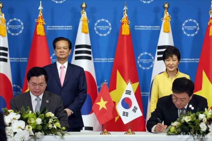 The two leaders witness the signing ceremony of the Minutes on the conclusion of free trade agreement talks between Viet Nam and the Republic of Korea. Photo: VGP