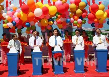 PM Nguyễn Tấn Dũng presses the button to start the construction of Cửa Đại Bridge, Quảng Nam Province, August 30 - Photo: VNA