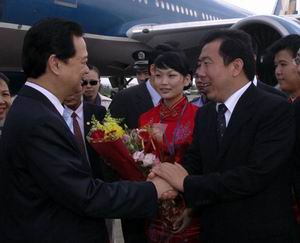 PM Nguyễn Tấn Dũng and his spouse arrive in Hainan - Photo: VGP
